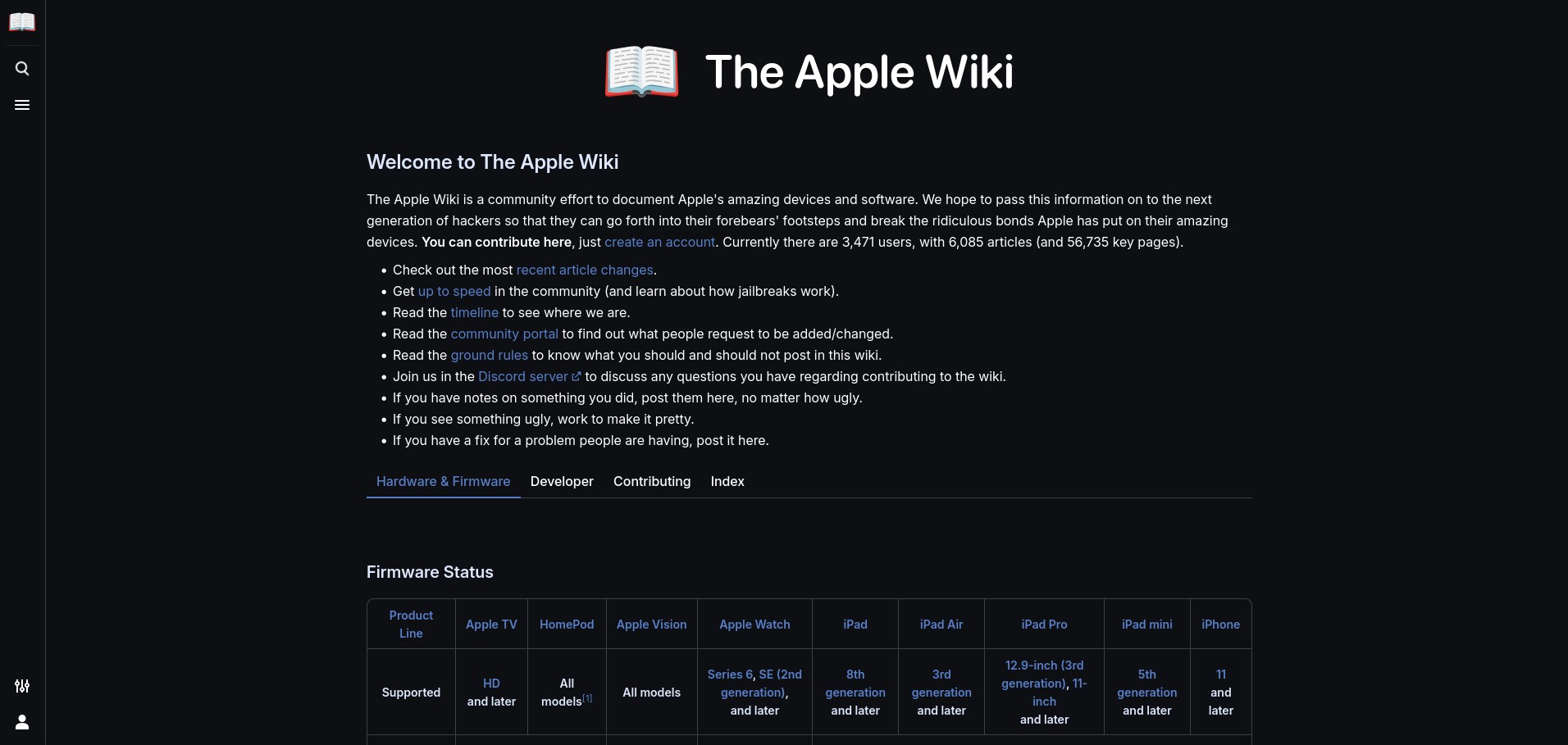 Das Apple Wiki ist ein Gemeinschaftsprojekt, das sich zum Ziel gesetzt hat, die fantastischen Geräte und Softwareprodukte von Apple zu dokumentieren. Wir möchten diese Informationen an die nächste Generation von Hackern weitergeben, damit sie in die Fußstapfen ihrer Vorfahren treten und die lächerlichen Beschränkungen aufheben können, die Apple seinen fantastischen Geräten auferlegt hat. Du kannst hier mitwirken, indem du einfach ein Konto erstellst. Derzeit gibt es 3.471 Benutzer mit 6.085 Artikeln (und 56.735 Schlüsselseiten).