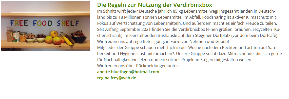 Dem Prinzip nach sowas Ähnliches wie Food-Sharing. Ein jedoch, tatsächlich von einem Arbeitskreis im Rathaus der Gemeinde, installiertes Essensrettungs-Schränkchen, auf öffentlichem Grund, mitten auf dem zentralen Dorfplatz, das von jedwede*r*m anonym und handelsfrei befüllt oder geleert werden kann, soll und darf. Die Lebensmittel darin aus dem Privatbestand öffentlich verfügbar zu stellen, oder eigenverantwortlich für den Eigenbedarf zu verbrauchen. Ganz ohne den üblichen juristischen Zirkus von Versicherung und Lebensmittelrecht, den vor allem öffentliche Stellen und wirtschaftliche Instanzen gewöhnlich – u.a. NGO-Organisationen wie foodsharing ausbremsend, und deren Abholer juristisch unverhältnismäßig in die Haftung drängend – ängstlich und verunmöglichend um solche Essensrettung-Bewegungen diskreditierend veranstalten. Ein Beispiel, das vor allem im ländlichen Raum (wo die eher urban verankerten Food-Sharing-Netzwerke oft nicht so stark vertreten, dafür aber noch die Aufbäckel-Mentalität und der Respekt vor Nahrungsmittel, seitens der älteren Generation) Schule machen und sich ausbreiten könnte. Denn dies Beispiel der Verwaltung und Arbeitskreises dieser Gemeinde zeigte, das geht verwaltungstechnisch und rechtlich sehr wohl, man muss bloß ehrlich und ernsthaft wollen, und es praktisch angehen, Konsum-Mentalität-Mißstände wandelnde, handelsfreie Interaktionsmöglichkeiten zu schaffen, dann wird das auch genutzt.