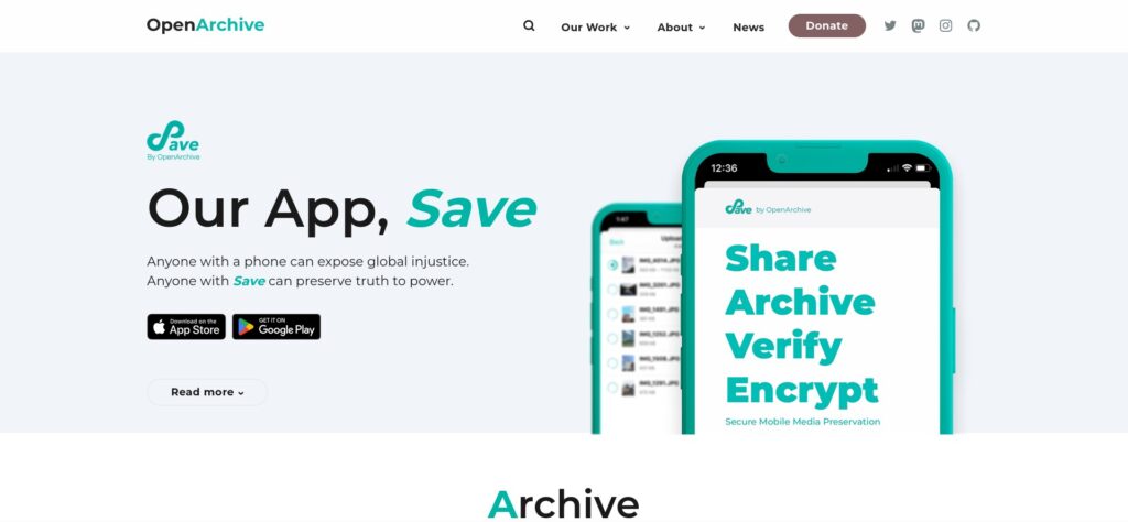 Save (Teilen, Archivieren, Verifizieren, Verschlüsseln) ist eine benutzerfreundliche App, die von OpenArchive entwickelt wurde, um dir beim Speichern, Teilen und Verstärken deiner mobilen Medien zu helfen und gleichzeitig sicherzustellen, dass deine Identität geschützt bleibt. Über die App kannst du Metadaten und Creative-Commons-Lizenzen zu deinen mobilen Audio- oder Videomedien hinzufügen und diese dann über TLS und das datenschutzorientierte Tor-Netzwerk an das Internetarchiv oder andere private Archive senden, wo sie gespeichert werden. Lade die App für iOS oder Android herunter.