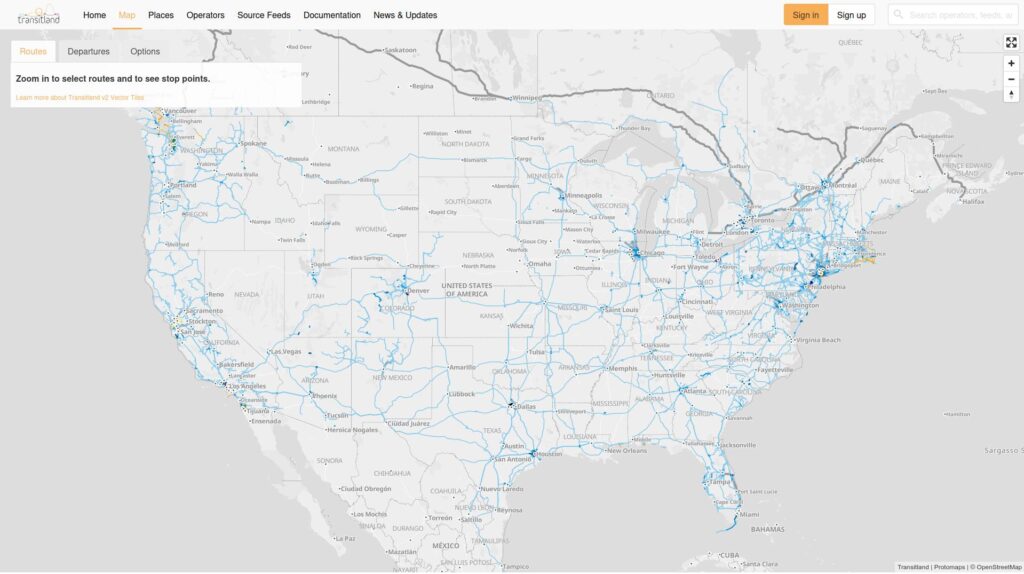 Transitland ist eine offene Datenplattform, die GTFS-, GTFS Realtime-, GBFS- und andere offene Datenfeeds von Verkehrsunternehmen aus der ganzen Welt sammelt. Transitland sammelt Daten von über 2.500 Verkehrsunternehmen in mehr als 55 Ländern. Nutzen Sie die Transitland-Website, um diese Datenwelt zu durchsuchen. Oder nutzen Sie die APIs von Transitland, um Ihre eigenen Karten, Datenvisualisierungen, Analysen, Fahrplanauskünfte oder Routing-Algorithmen zu erstellen.